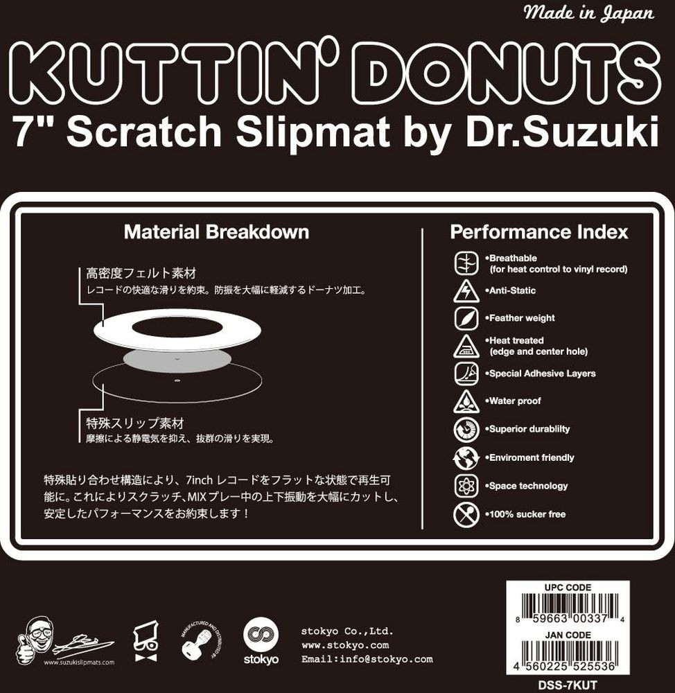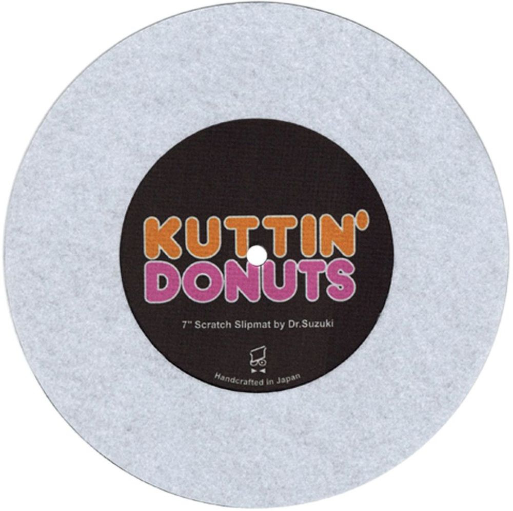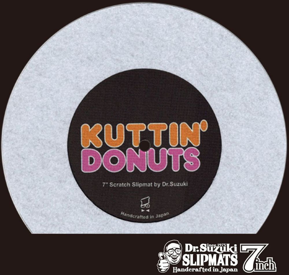 A Dr. Suzuki Kuttin’ Donuts 7" Slipmat talán az első kifejezetten scratch-elésre tervezett slipmat 7” lemezekhez. A slipmat a 12” és 7” lemez között pozícionálható, így a 7” lemez ugyanúgy kényelmesen és pontosan irányítható, mint a 12” lemez. A kivágott középső rész lehetővé teszi a görbült vagy eldeformált lemezek lejátszását.