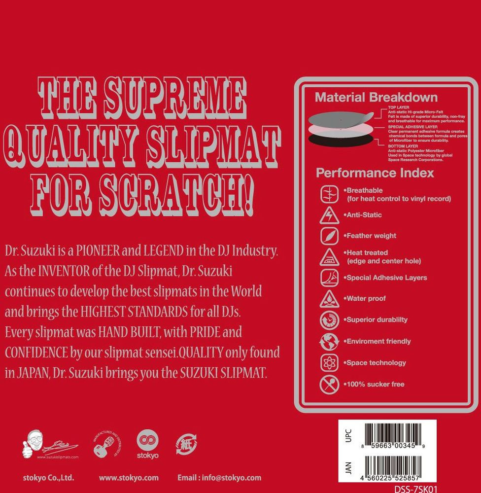 A Dr. Suzuki, a D-Styles "Tablecloth" és a Serato "Scratch Live" Slipmat-ek feltalálója, bemutatja az új Dr. Suzuki 7" Skratch Edition Slipmat-et. Ezt a slipmat-et kifejezetten a turntablism DJ-k igényeihez tervezték, a Tablecloth D-Styles slipmat-ek utódjaként. A 7" Skratch Slipmat nagyon vékony, filcszerű felépítéssel rendelkezik. Rendkívül sima alsó felületének köszönhetően a scratchelésnél kiemelkedő kontrollt biztosít a lemez felett.