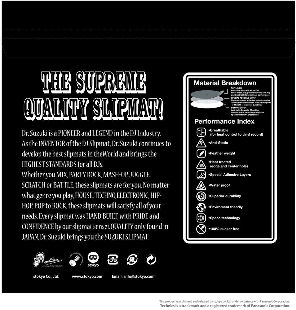A Dr. Suzuki legújabb együttműködése a Technics márkával jött létre. A Stokyo által készített slipmatok több mint 40 éve bizonyítják kiváló minőségüket és tökéletes kezelhetőségüket scratch vagy mix használat során. A slipmat tartóssága révén a vinyl kezelésekor keletkező zaj jelentősen csökken, így a mozgás simább lesz. Továbbá a slipmat átmérője kisebb, mint egy hagyományos vinylé, így megakadályozza, hogy a vinyl a cserénél a statikus töltés miatt a slipmathez tapadjon.