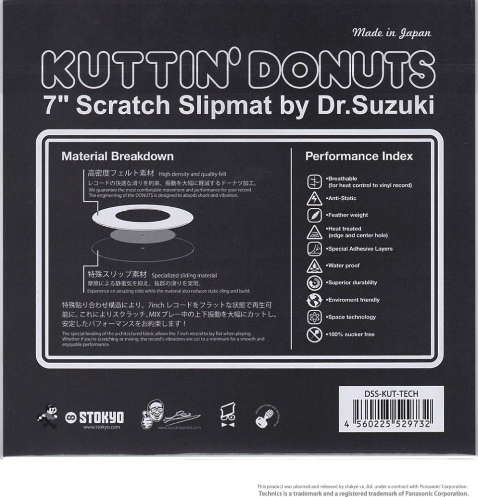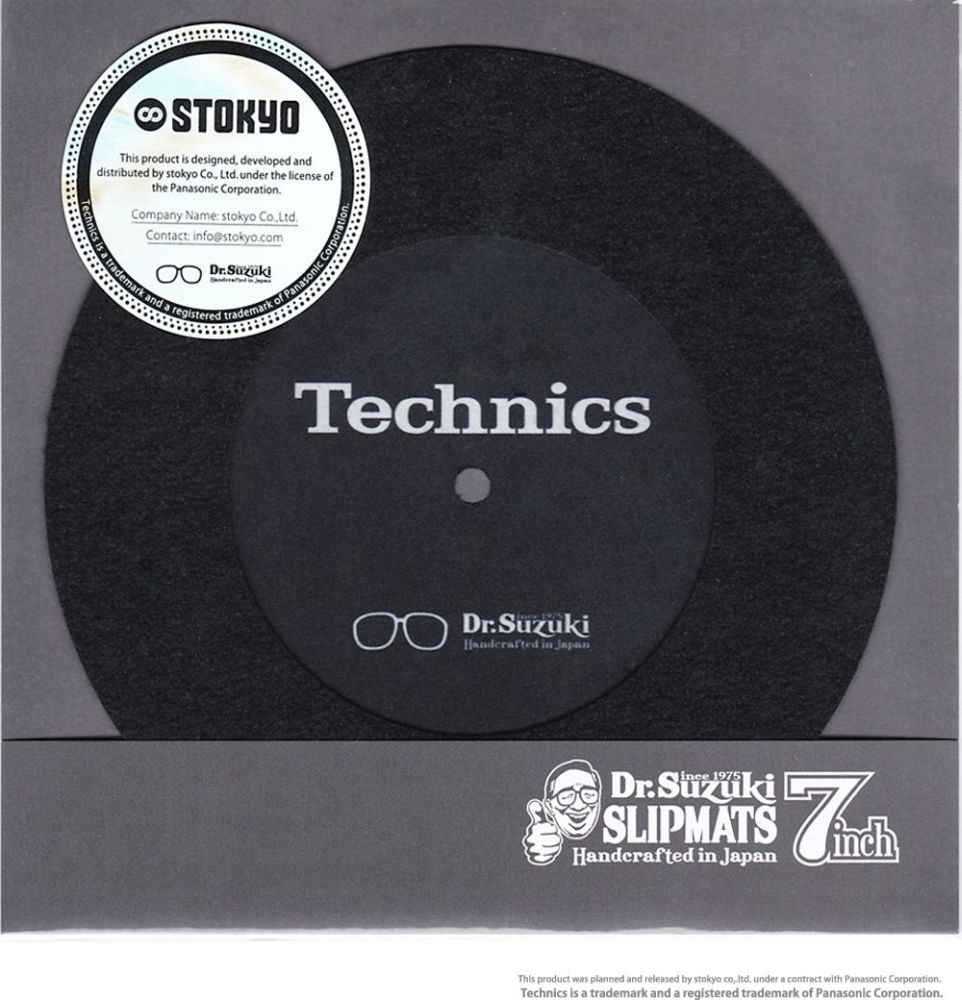 A Dr. Suzuki legújabb együttműködése a Technics márkával jött létre. A Stokyo által készített slipmatok több mint 40 éve bizonyítják kiváló minőségüket és tökéletes kezelhetőségüket scratch vagy mix használat során. A slipmat elhelyezhető 12" és 7" lemez között, így a 7" lemez ugyanolyan kényelmesen és pontosan kezelhető, mint a 12" lemez. A speciálisan kivágott középrész lehetővé teszi a görbült vagy deformált vinyl lejátszását is.